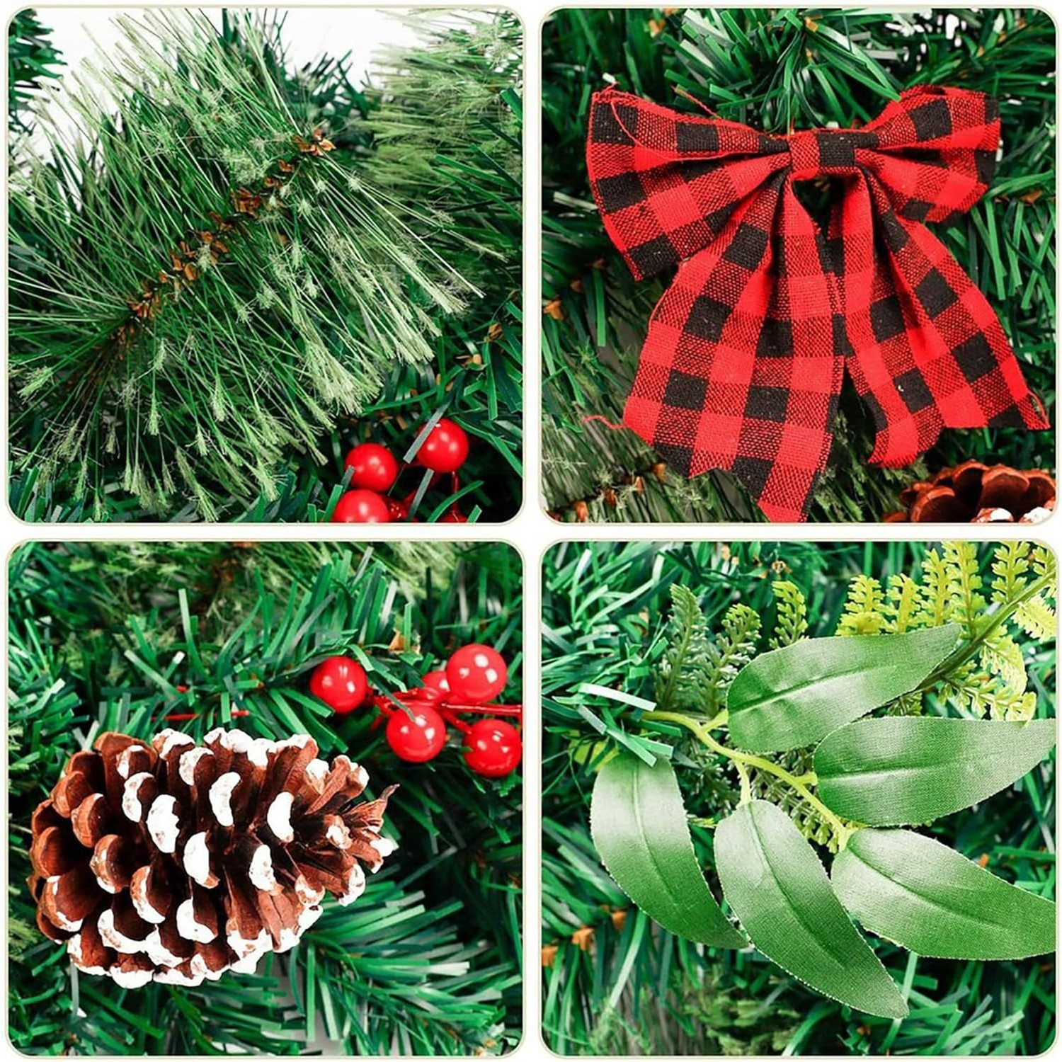 Ghirlanda este realizata din PVC si are lungimea de 270 centimetri. Ghirlanda confectionata din frunze verzi este impodobita cu fundite rosii si conuri de brad.